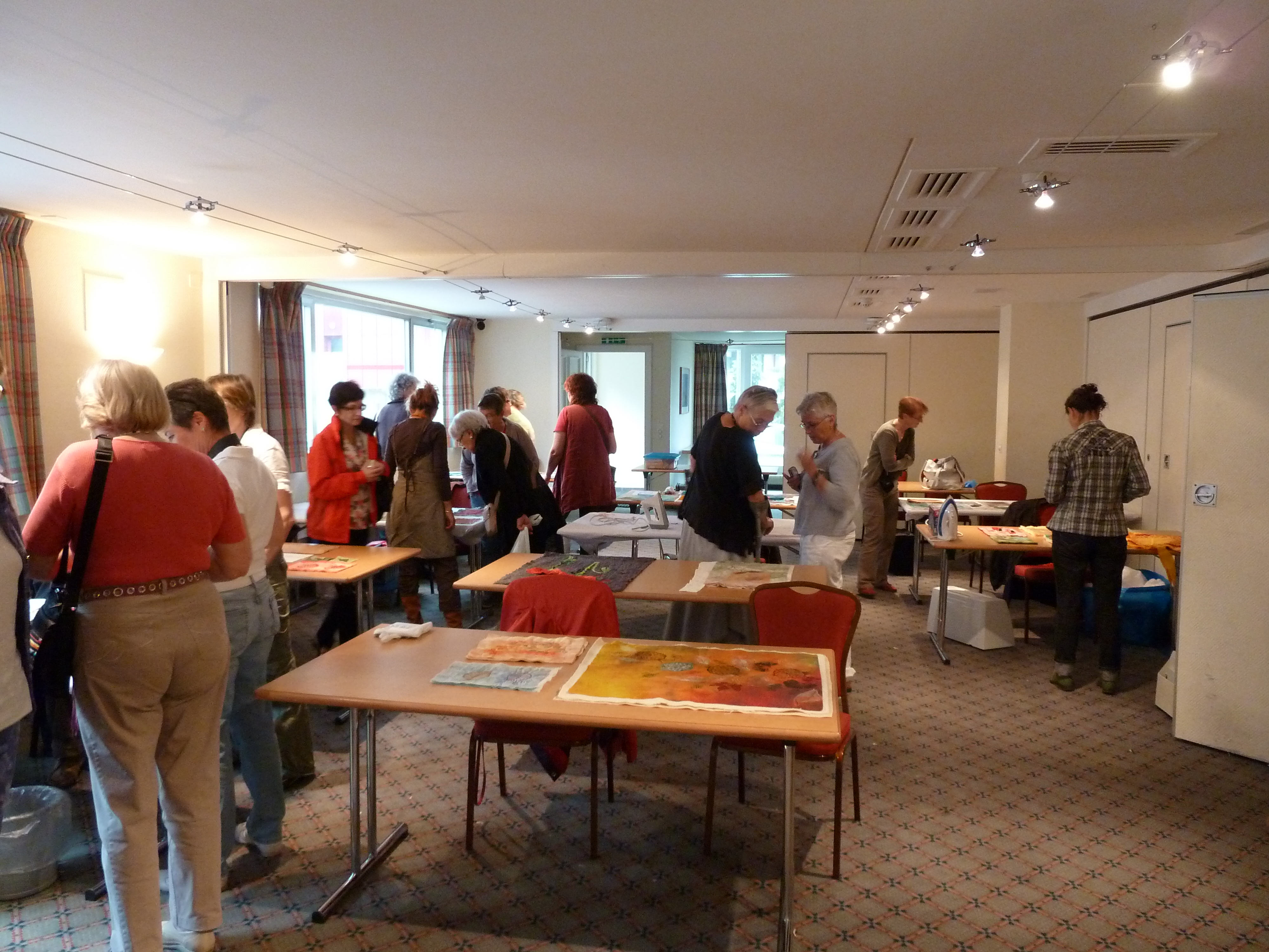 Créer un trait d’union entre artistes et passionnées d’arts textiles : le défi lancé par Ose et fais est gagné ! Nous étions 24 participantes à vivre notre passion qui était orchestrée par Liz Berg et Dijanne Cevaal. Liz Berg nous a emmenées dans l’univers de la création artistique en nous guidant sur le chemin de la couleur. L’exploration de la roue des couleurs s’est faite au moyen de nos tissus. Nous avons décrypté les éléments et les principes du design en apprenant les subtilités et les associations des tons, des teintes, des valeurs, des mouvements, des tailles, des structures que nous offrent les tissus. Sur ce chemin, nous avons également découvert les finesses de la conception d’une œuvre contemporaine avec la méthode du fusing. Dijanne Cevaal a conduit ses élèves dans le périple du transfert d’impression. C’est une méthode qui permet d’obtenir une coloration permanente sur des matériaux synthétiques (lutradur). Ce transfert d’impression méritant une exploration plus personnelle, chaque participante se devait de trouver le chemin de sa propre inspiration créative, au moyen de superposition, brûlage, piquage etc. Comme la météo qui nous accompagnait ne nous a pas fait profiter du magnifique panorama que Leysin était censé nous offrir, nous avons partagé notre passion commune à l’intérieur de l’hôtel, dans une ambiance chaleureuse et amicale. Nos deux guides, Liz et Dijanne, ont merveilleusement su nous insuffler l’étincelle créative par leur savoir-faire et leur talent. Rendez-vous à la prochaine édition.
